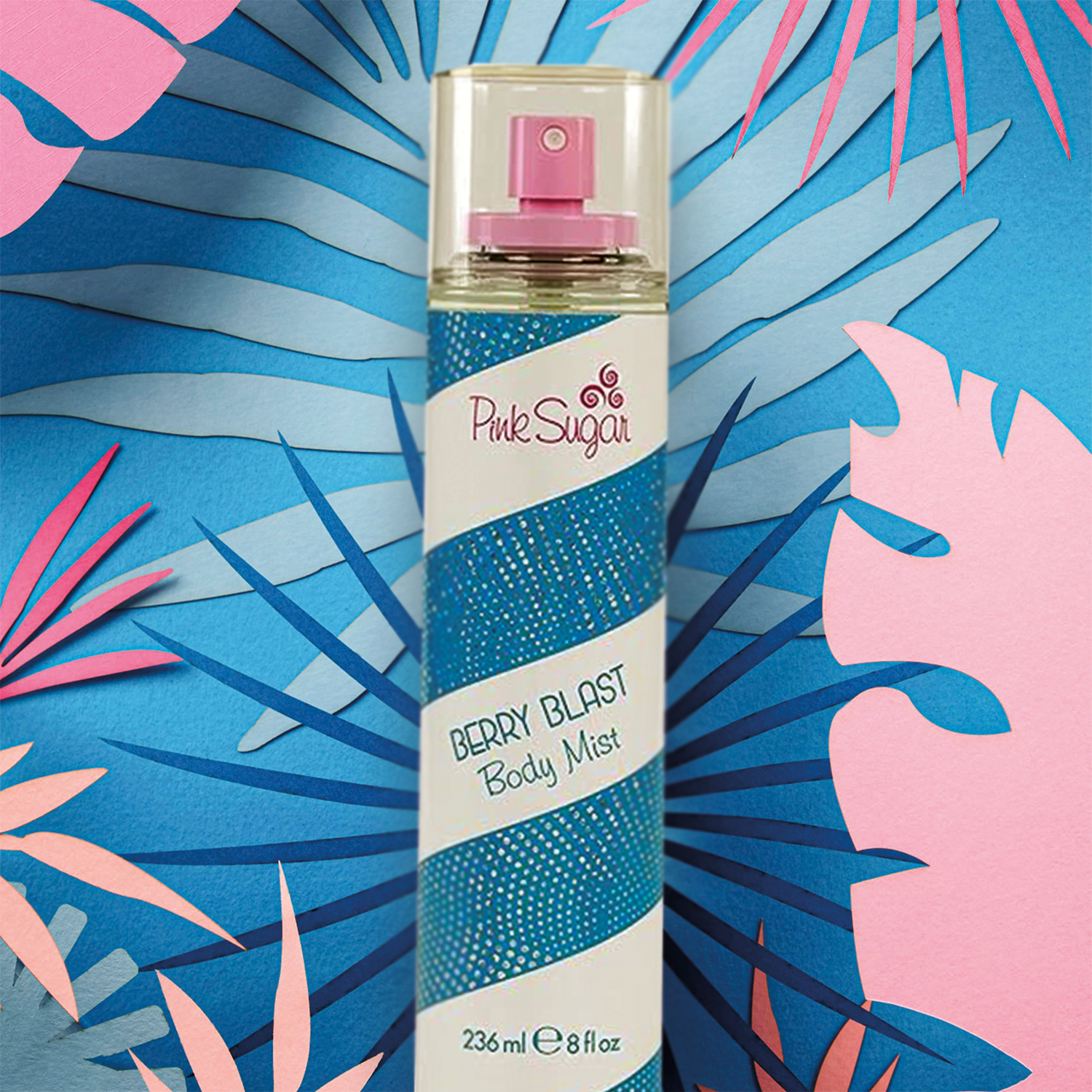 عطر Pink Sugar المنعش والحديث ذو لمعان غير لزج، يستحضر الأحلام الجميلة وذكريات الطفولة، الآن في Berry Blast Body Mist.