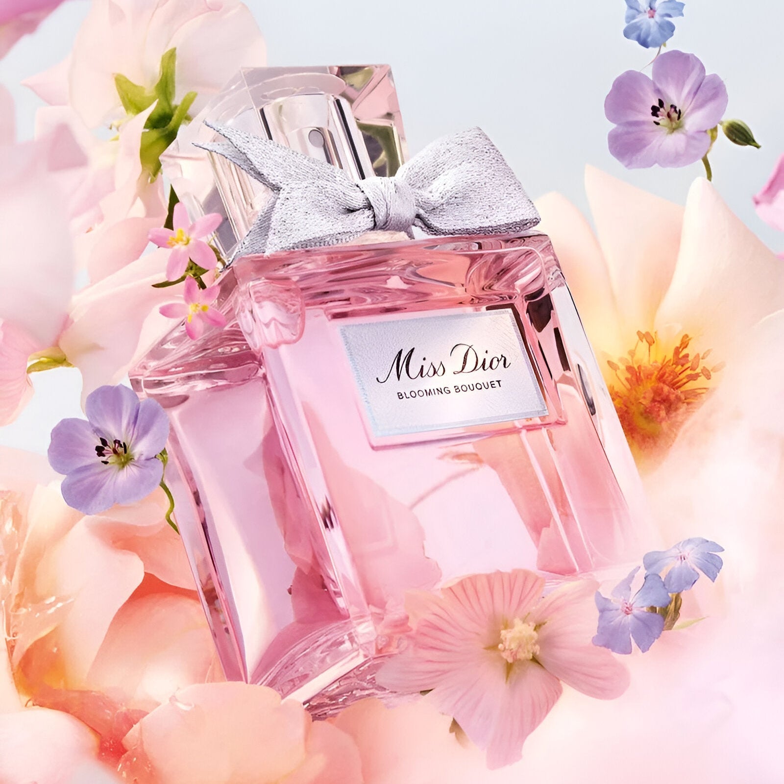 باقة Miss Dior Blooming Bouquet: تحية زهرية تتكون من زهرة الفاوانيا ووردة دمشق، متوفرة بأحجام ومجموعات هدايا مختلفة.