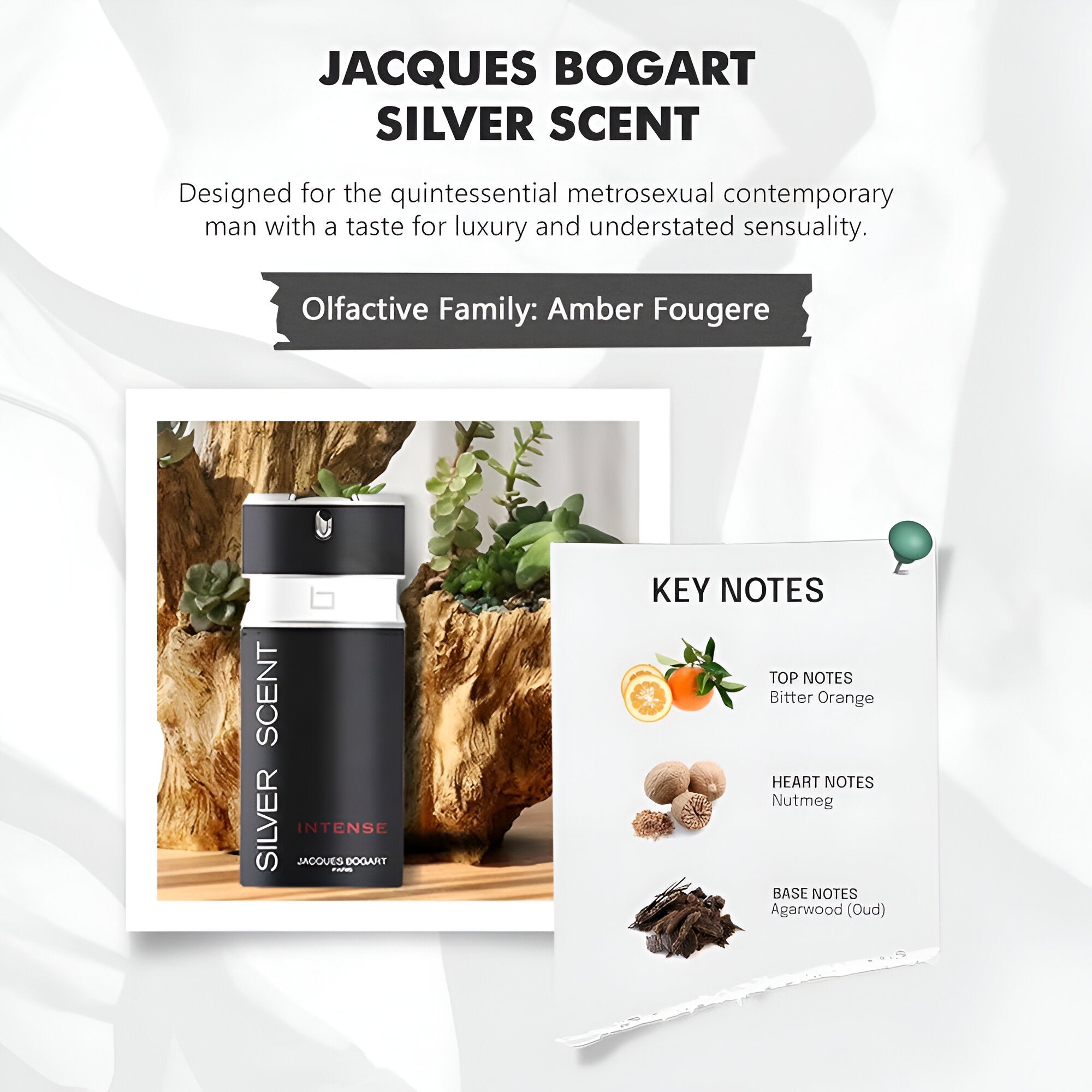 أطلق العنان لجوهر الرجولة مع بخاخ الجسم Silver Scent Intense من Jacques Bogart.
