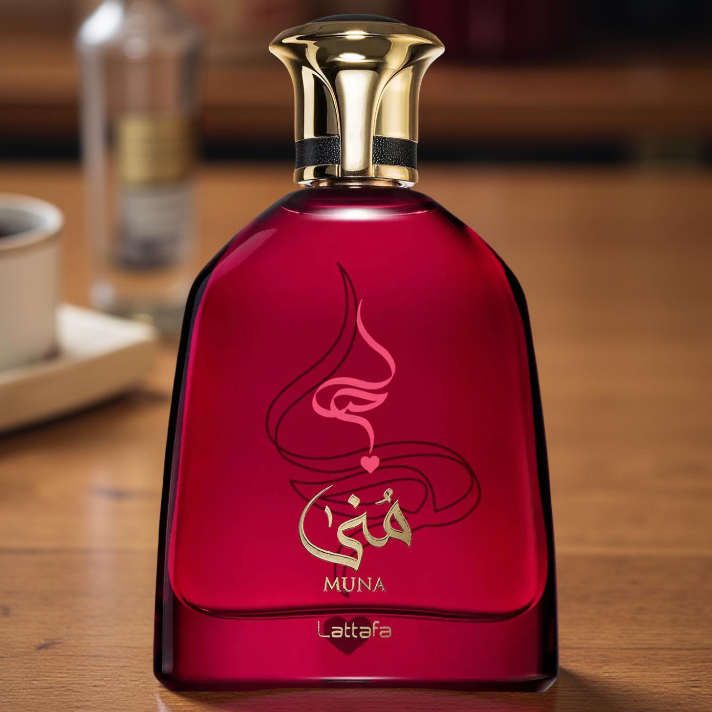Lattafa Muna EDP smells sweet and fresh with fruity notes of watermelon and strawberry at the top, followed by floral scents of peony and rose, and finishes with a warm blend of musk and woody notes.