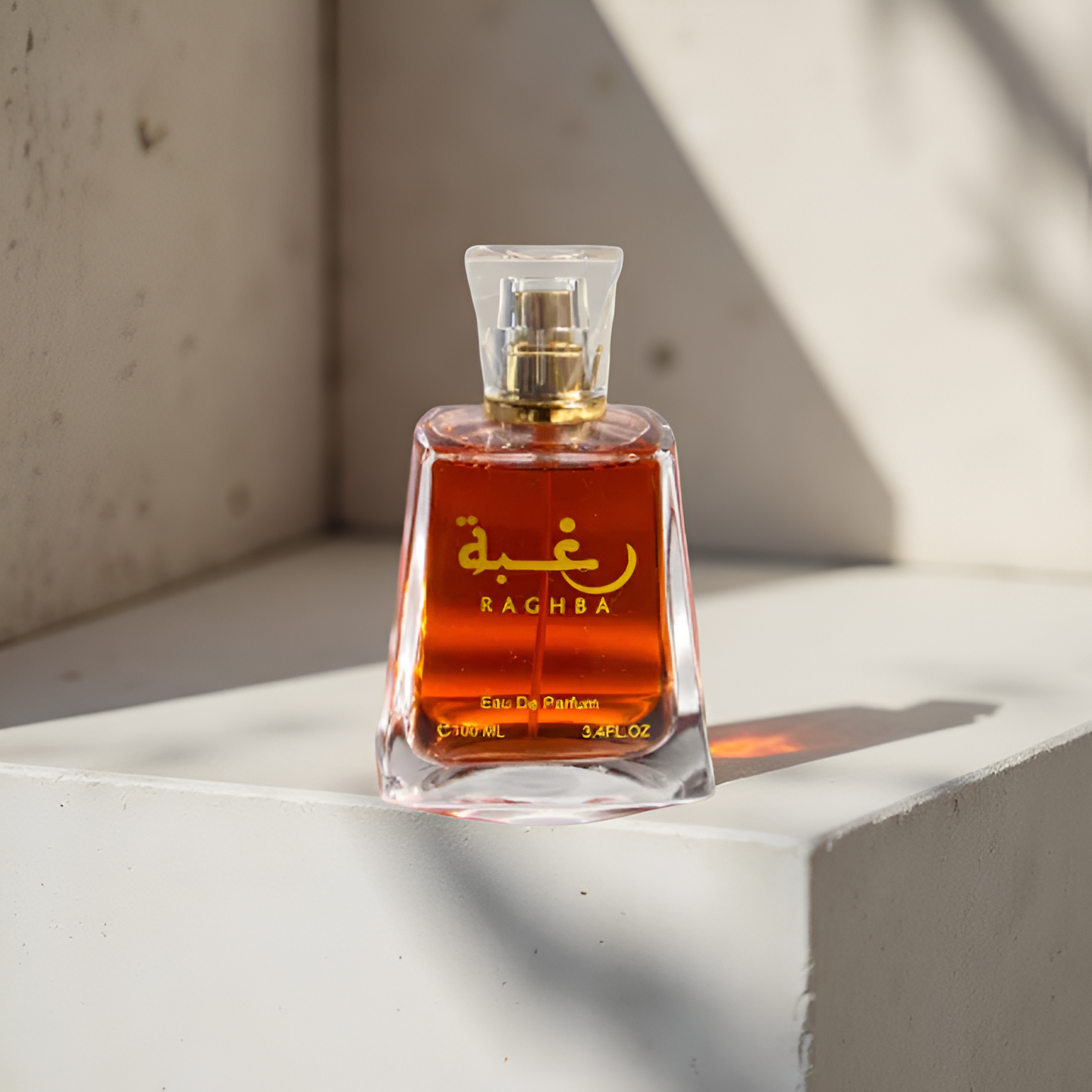 Raghba by Lattafa is an Oriental Amber Vanilla fragrance with notes of sugar, incense, oud, and musk, praised for its warmth.