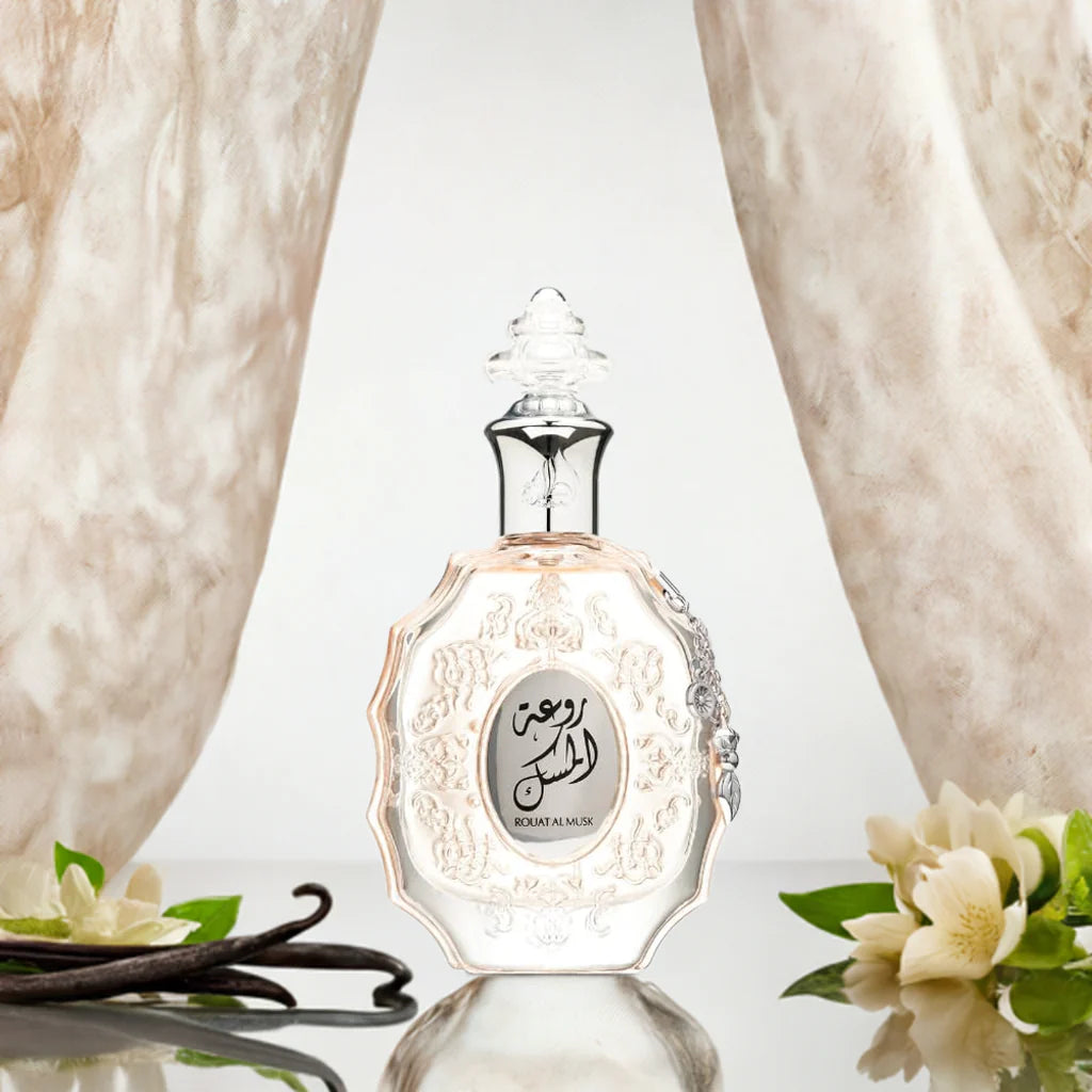 Lattafa Rouat Al Musk EDP smells sweet and fresh with notes of fruity mandarins and orange blossoms at first, followed by soft white flowers and creamy sandalwood, and finishes with warm amber and vanilla.