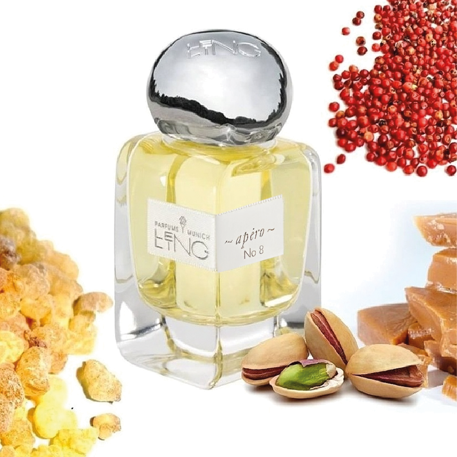يُصدر عطر Lengling Munich Apero No.8 Extrait De Parfum رائحة متوازنة ومتطورة، حيث يمزج بين جرأة الأومي الفاكهي مع لمسة من الجن المنعش.
