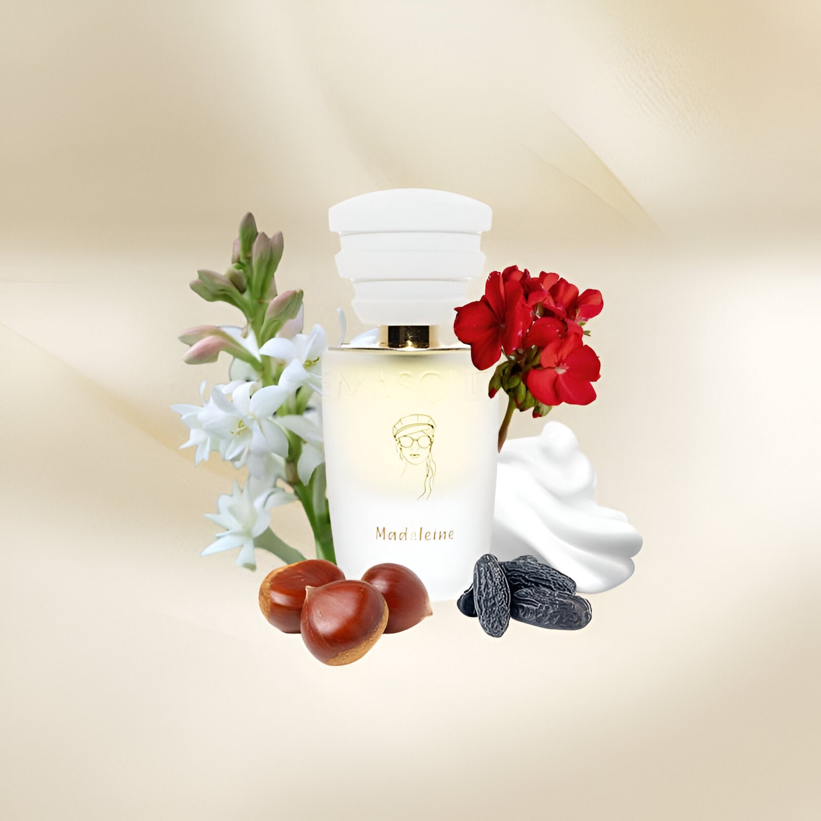 يتكشف عطر Masque Milano Madeleine Fanny Bal EDP كمزيج زهري حلو يمزج بين الكستناء الكريمي والكريمة المخفوقة مع قلب من مسك الروم والسرو، من صنع Fanny Bal الموقرة لتجربة عطرية لا تنسى.