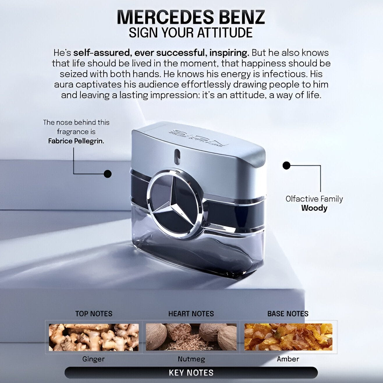 يعد عطر Mercedes-Benz Sign Your Attitude EDT عطرًا جذابًا يفاجئ ويغوي، ويترك أثرًا لا ينسى يجسد جوهر الرجل الذي يرتديه.