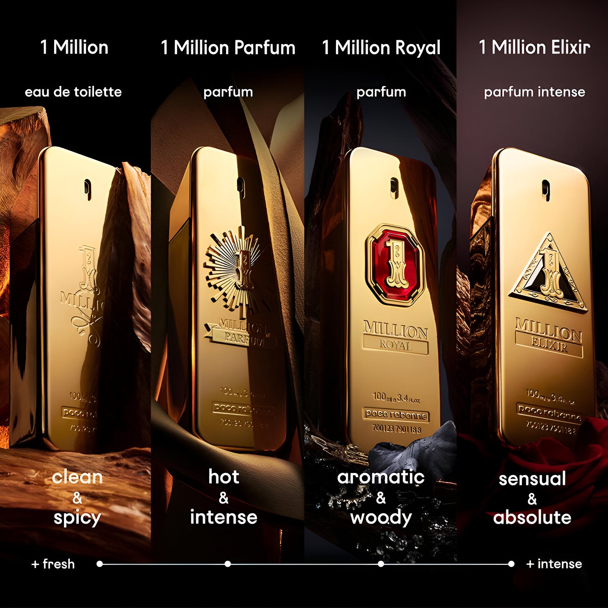 يتميز عطر Paco Rabanne 1 Million Elixir برائحة منعشة وخشبية مكثفة، مع ثراء عميق وحسي ومزيج من المكونات الترابية والدفء الحلو.