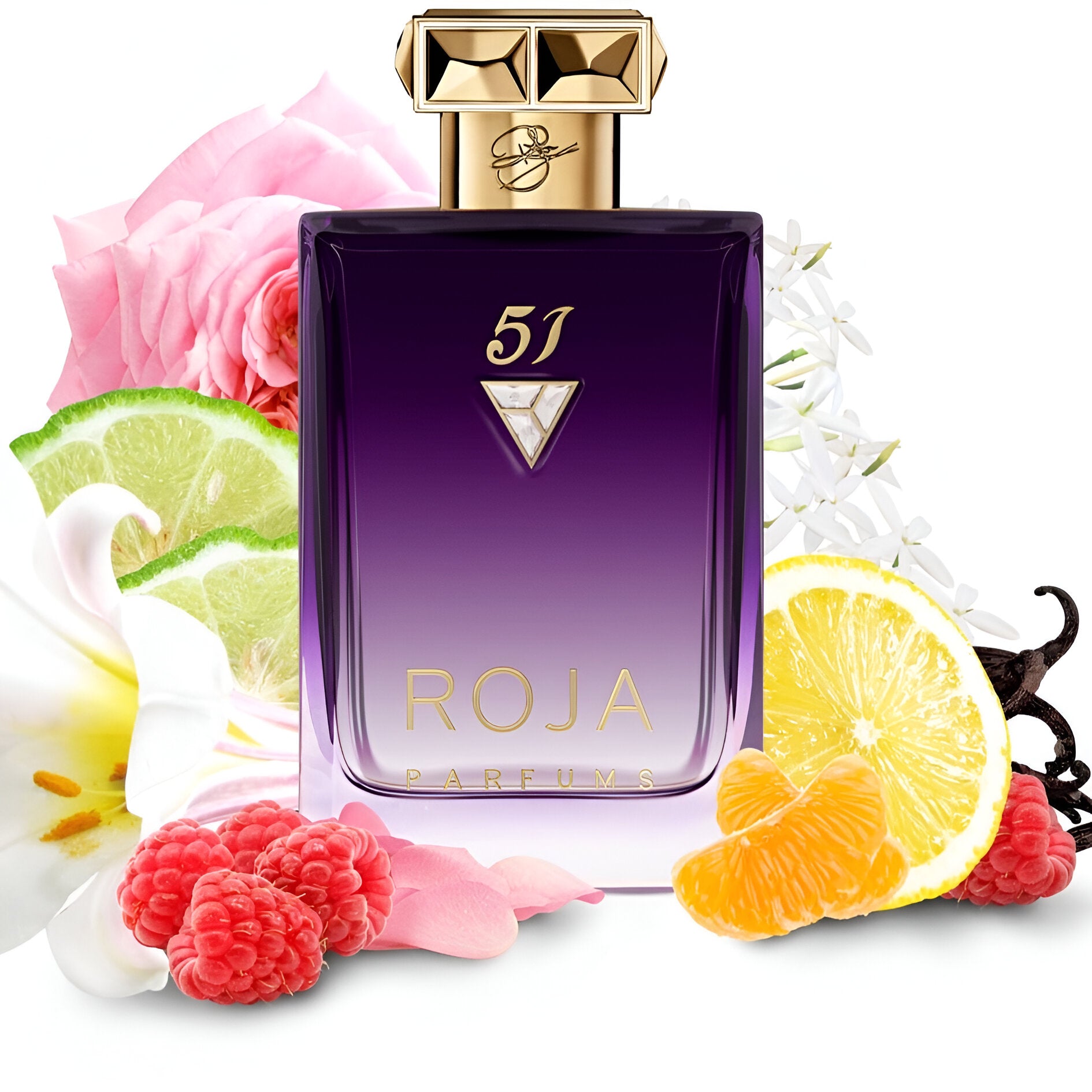 يتمتع عطر Roja Parfums 51 Pour Femme برائحة الياسمين والورد مع نفحات الفواكه والزهور والخشب، مع لمسات من البرغموت الطازج والتوت.