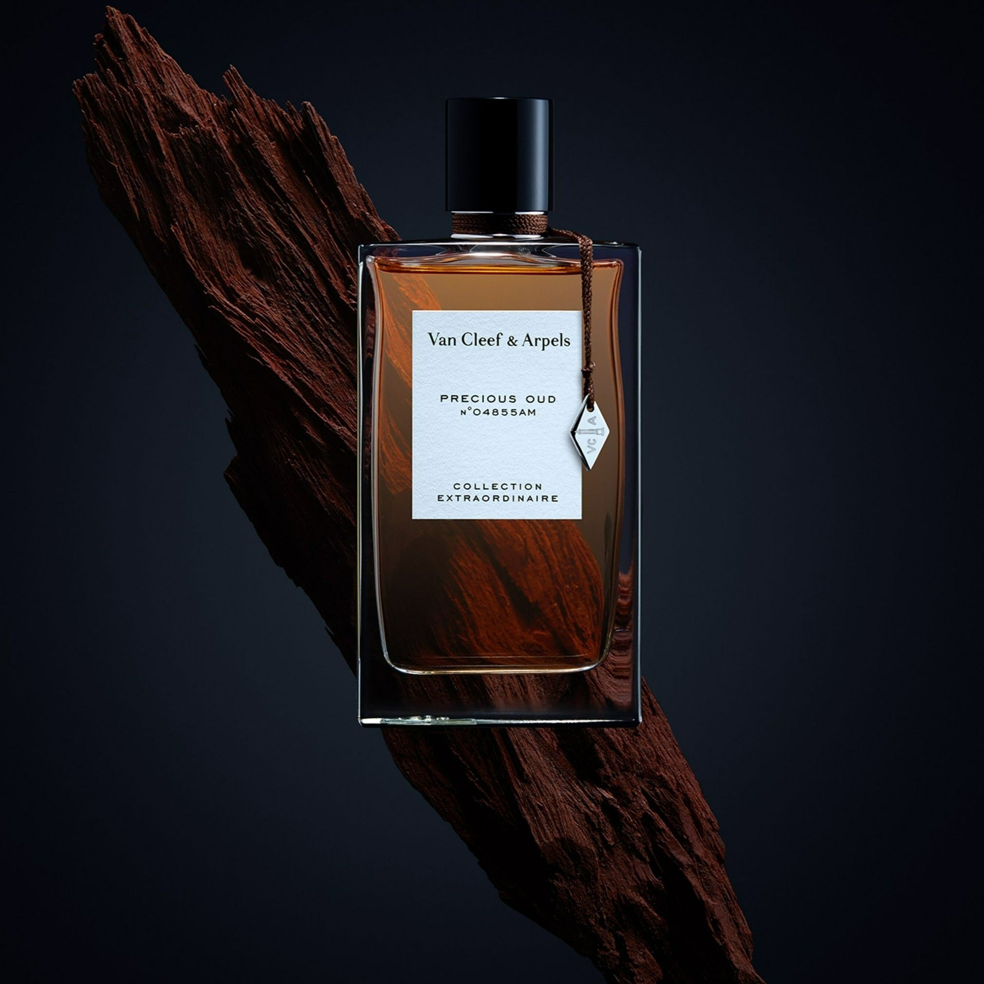 استمتعي بأناقة لا مثيل لها مع عطر Precious Oud من Van Cleef & Arpels - الفخامة والدفء والفن في زجاجة.
