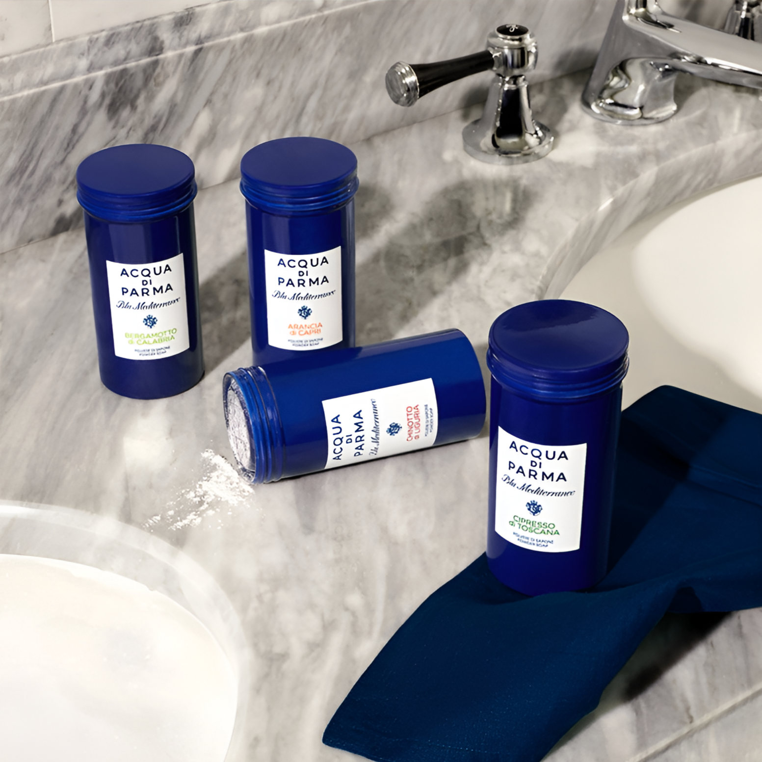 Indulge in the luxurious embrace of Italian Mediterranean aromas with Acqua Di Parma Blu Mediterraneo Chinotto Di Liguria Powder Soap.