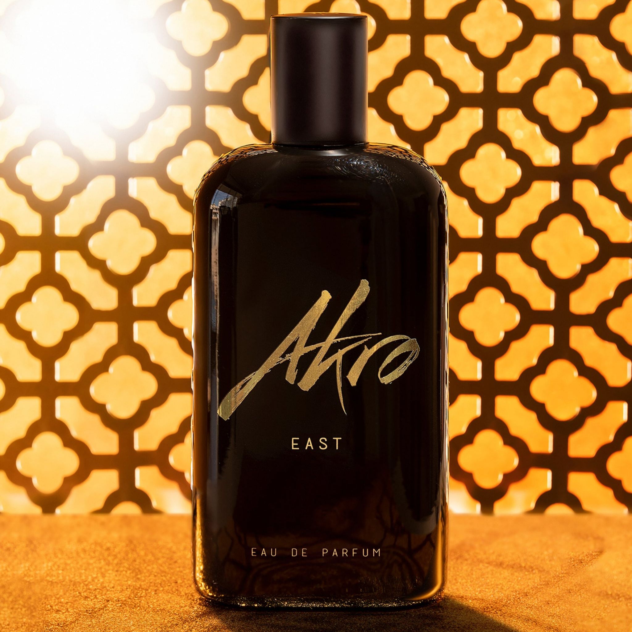 Akro's East EDP: A balanced, smooth, and elegant fragrance blending oud, raspberry, and leather for a rich, high-performing scent.