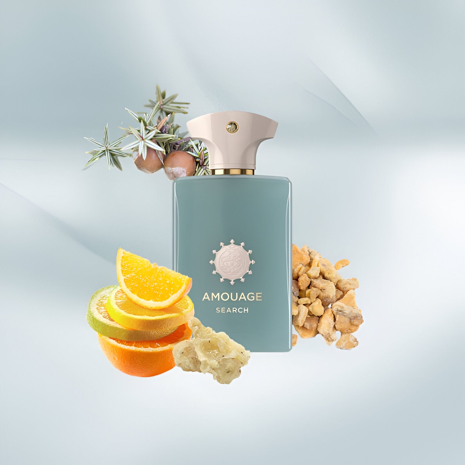 Amouage Search EDP unfolds as a luxurious citrus-infused scent with a deep, enduring woody incense finish, inspired by the rich heritage of a high-end niche fragrance house.