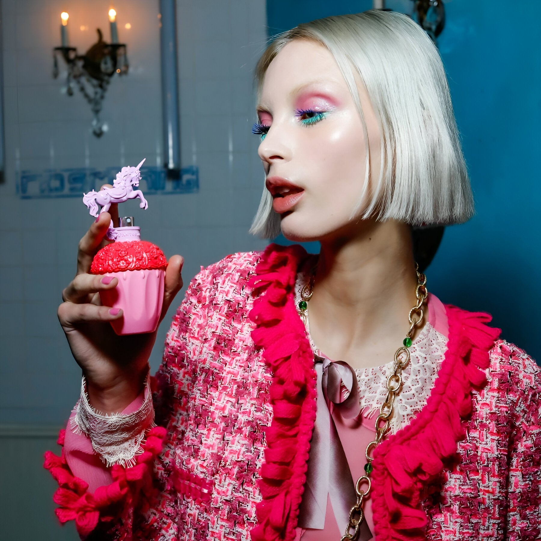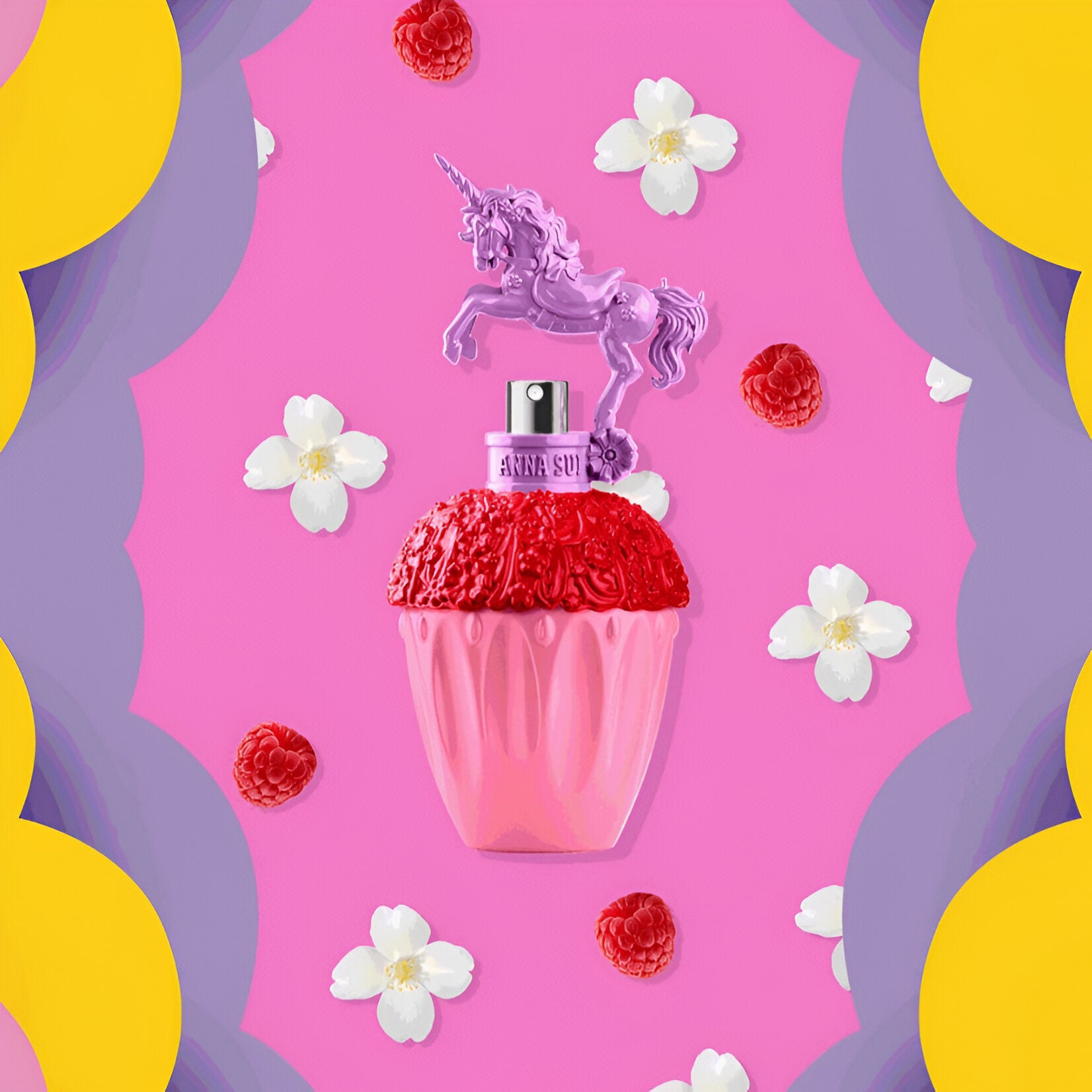 Anna Sui Fantasia Pop Surprise! Red Purple EDT smells vibrant and playful, featuring fresh bergamot, spicy pink pepper, floral peony, and warm cedarwood, all inspired by the fun and creativity of '60s Pop Art.