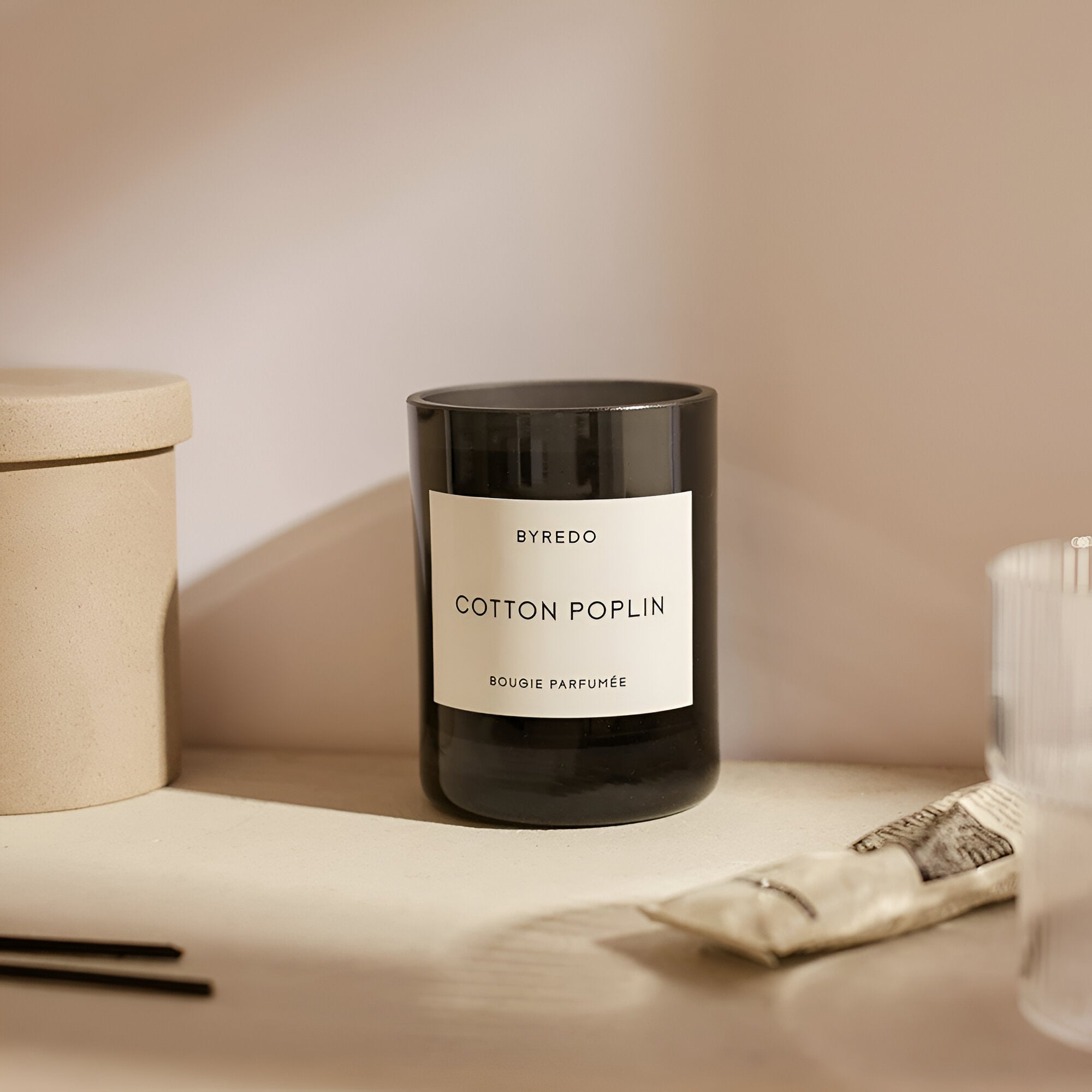 The Byredo Cotton Poplin Candle exudes a clean, floral fragrance that combines the soothing scents of blue chamomile, crisp linen, white cedarwood, and a whisper of sweet musk, evoking the serene comfort of freshly laundered fabrics.