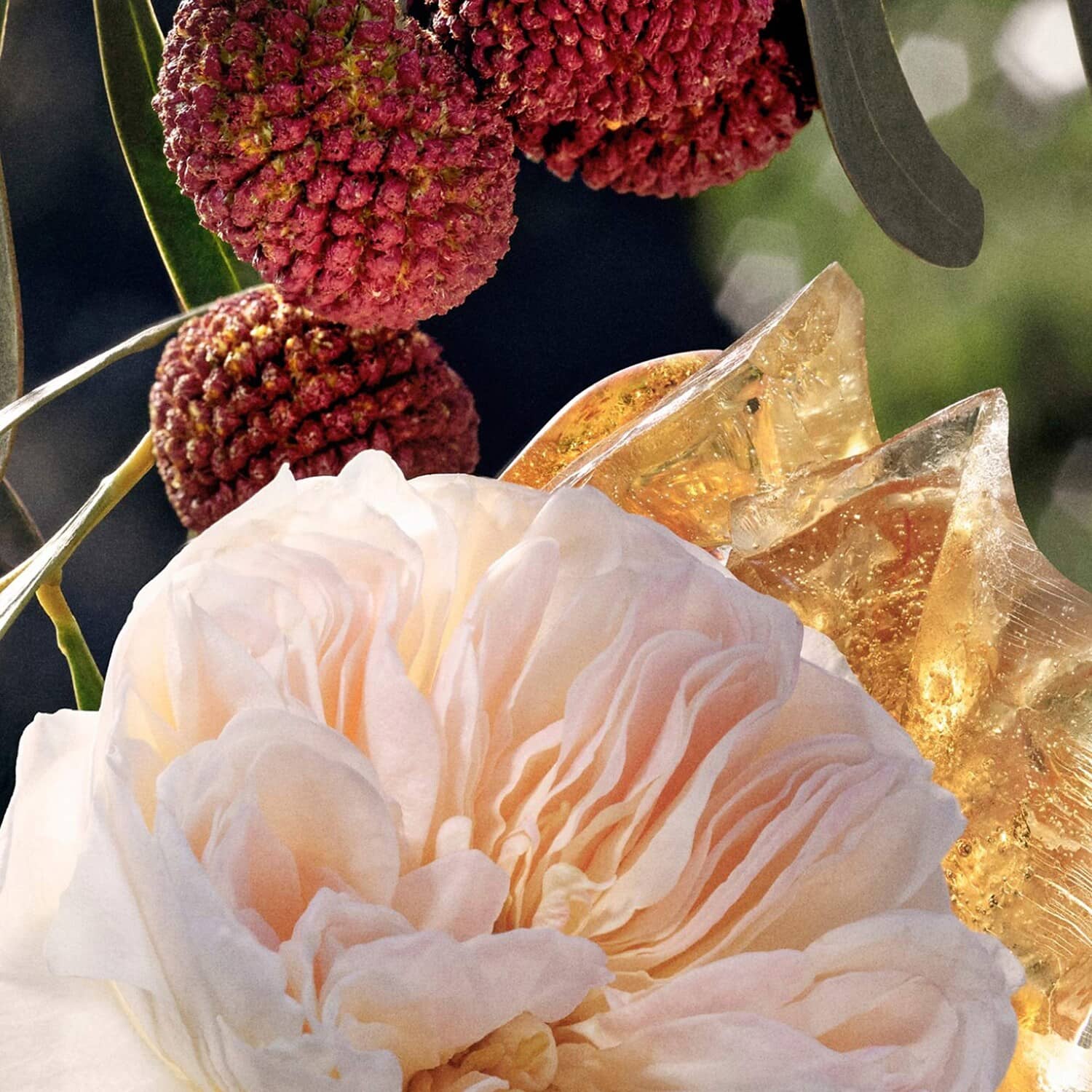 The intensity and depth of the Damascena rose is amplified, blending seamlessly with Grasse's Centifolia rose absolute.