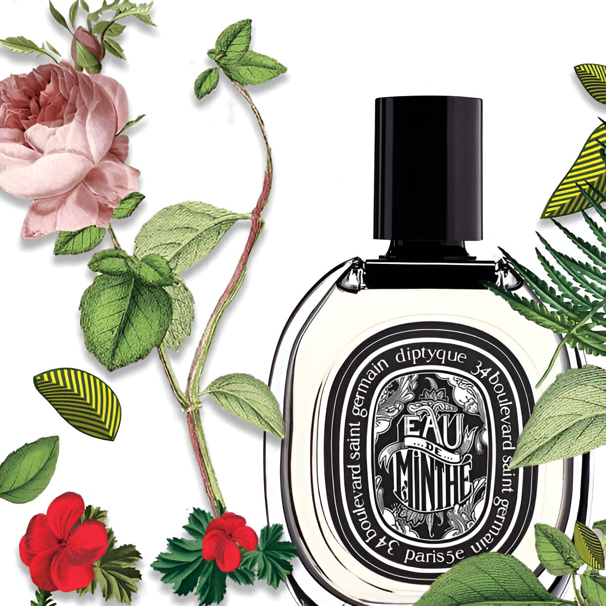 Explore Diptyque's Eau de Minthé, a mint-infused fragrance with nutmeg, geranium, and patchouli, inspired by Greek nymph myths.