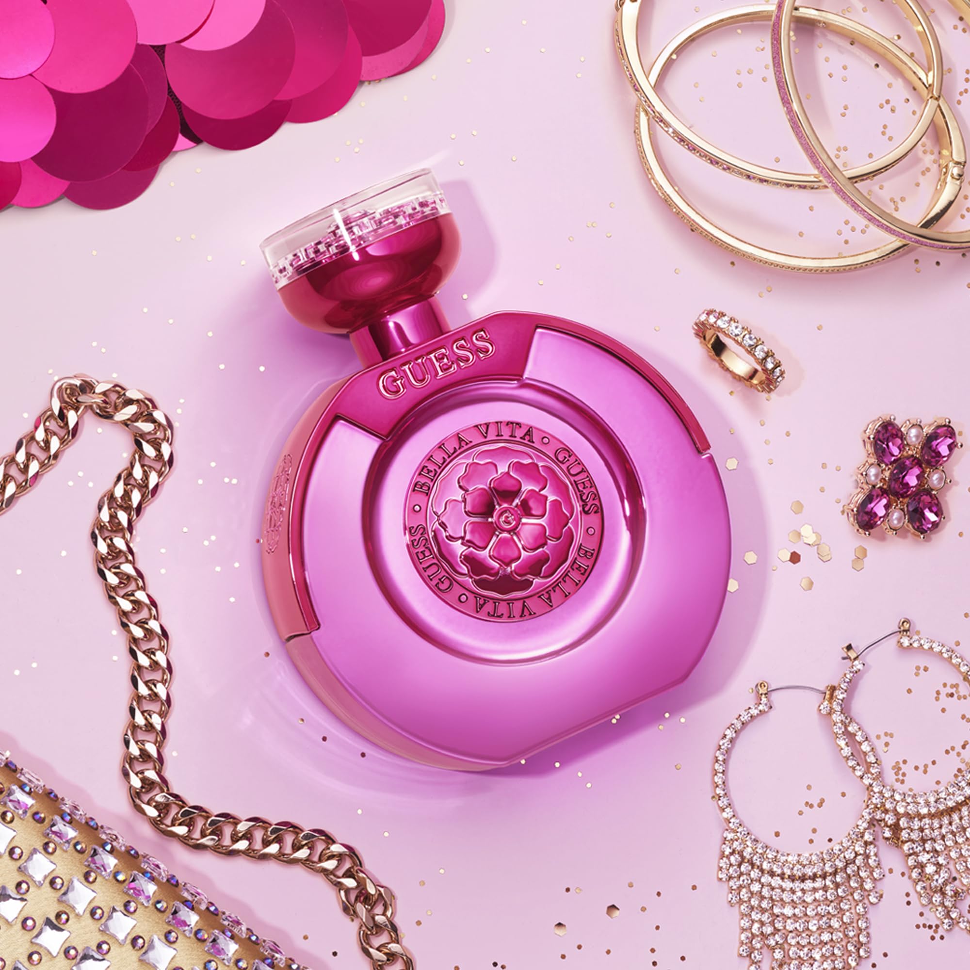 Guess La Mia Bella Vita smells like a bright, fruity-floral blend of pear, lychee and bergamot with spicy pink pepper and a heart of rose and jasmine, softened by creamy vanilla and musk.
