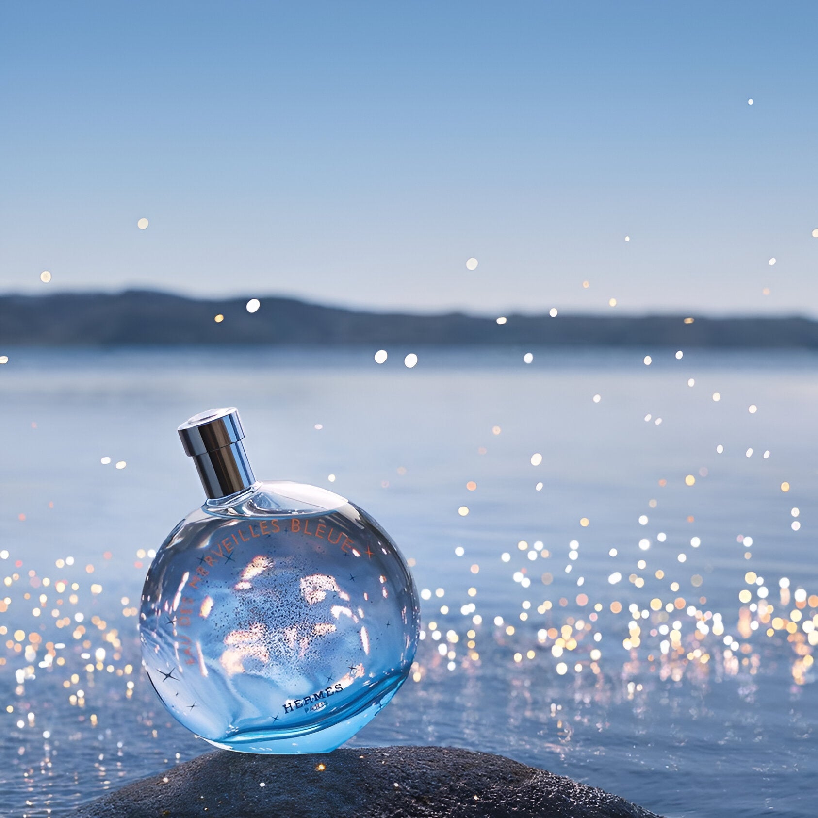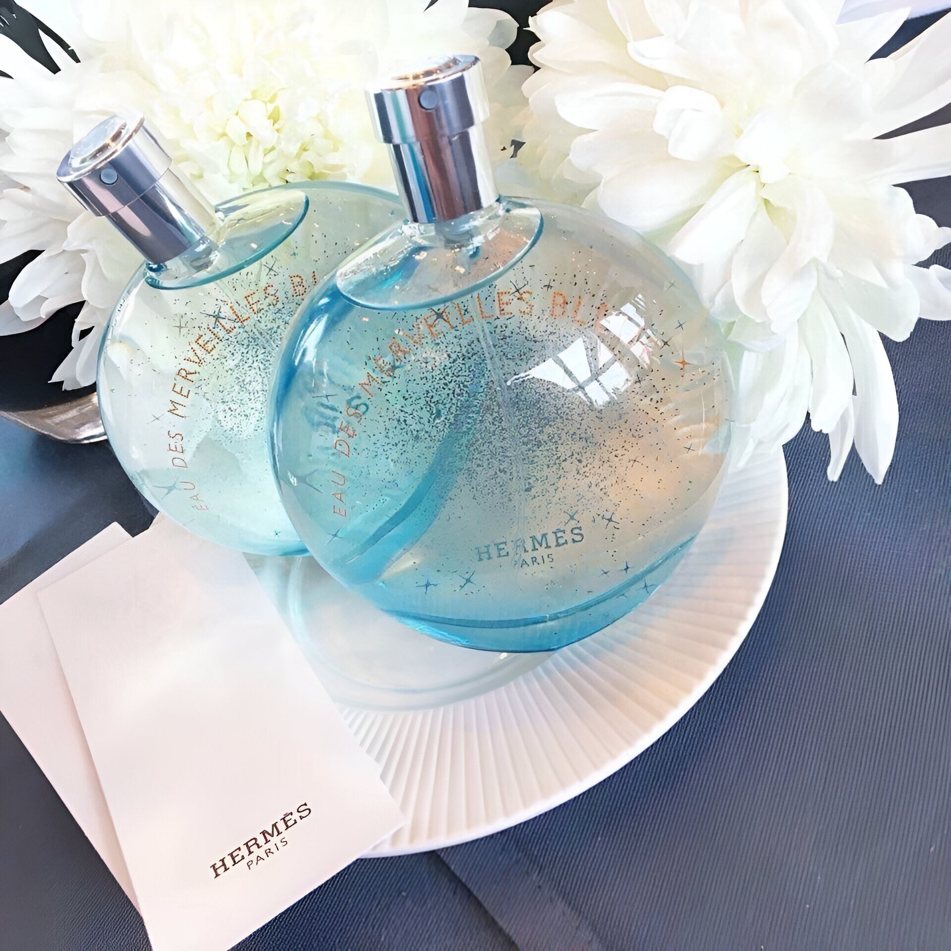 Embark on a sensory journey with Hermes "Eau des Merveilles Bleue" – where magic meets the ocean breeze.