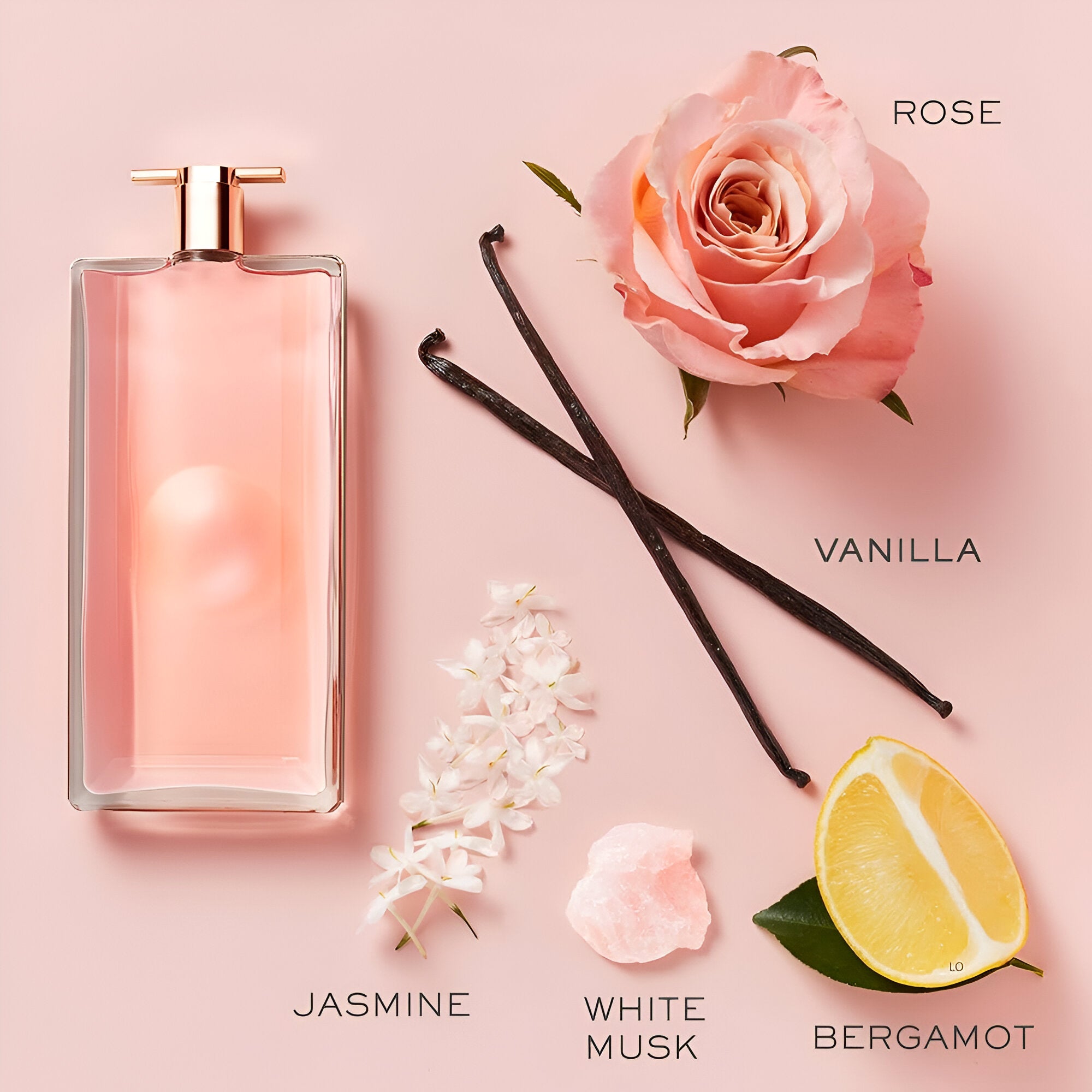 Lancome Idole Now EDP Florale smells like a rich bouquet of flowers with a hint of vanilla, enhanced by a subtle ambery citrus undertone, creating a passionate and elegant fragrance.