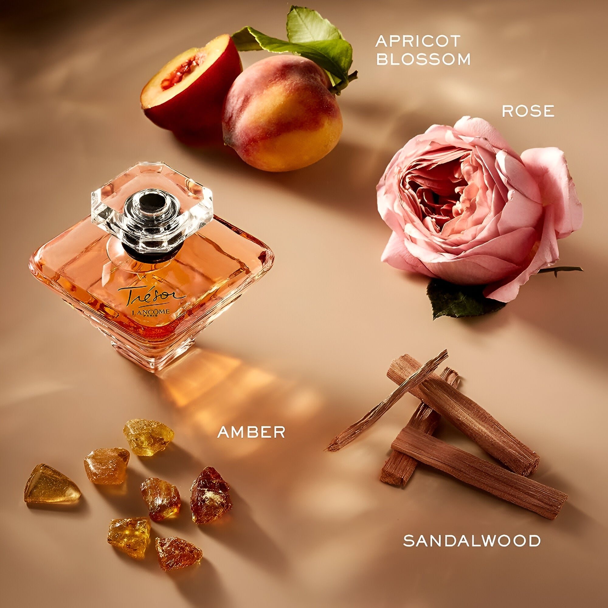 Featuring top notes of rose petals, apricot blossoms, and peach tree flowers, middle notes of lilly of the valley, vanilla, heliotrope, and iris, and base notes of sandalwood and musk, Trésor is a truly unique and unforgettable fragrance.