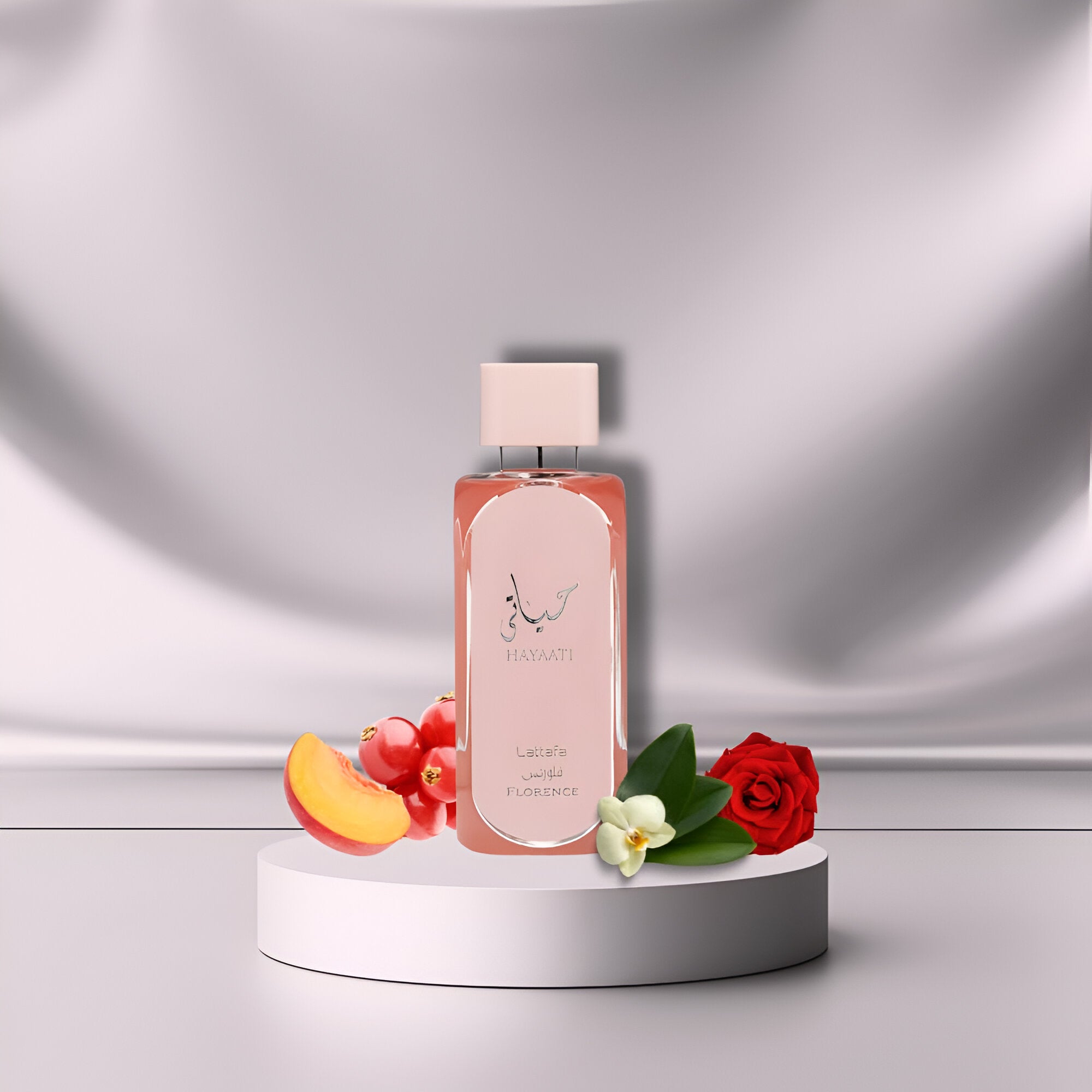 Lattafa Hayaati Florence EDP is a sweet, floral fragrance with citrus notes, ideal for the modern woman and lasting up to 6 hours.