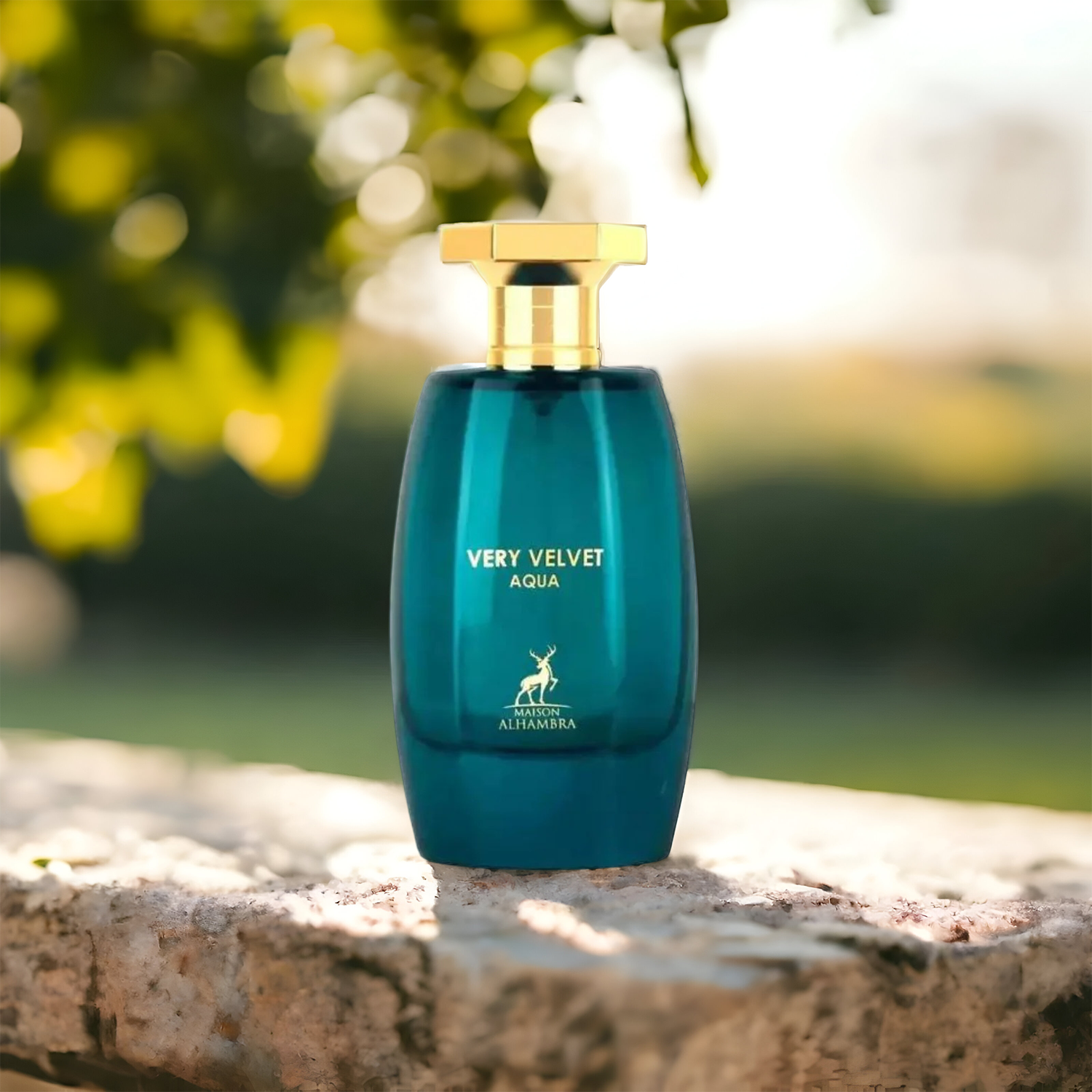Maison Alhambra Very Velvet Aqua EDP smells like a refreshing summer breeze, combining zesty citrus notes of bergamot and neroli with soft floral and woody undertones, creating a captivating and elegant fragrance perfect for any occasion.