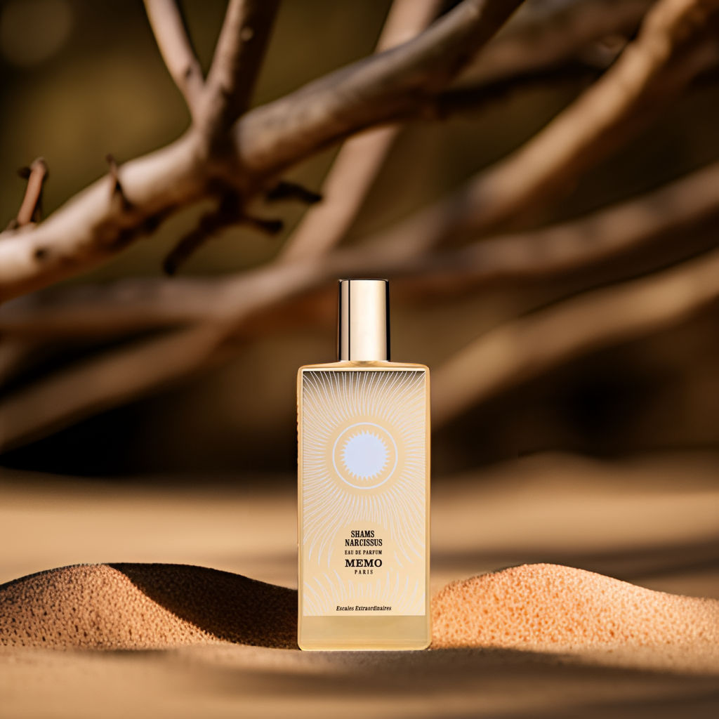 Embrace the radiance of Memo Escales Extraordinaires Shams Narcissus EDP, where the sun's warmth meets majestic scents.
