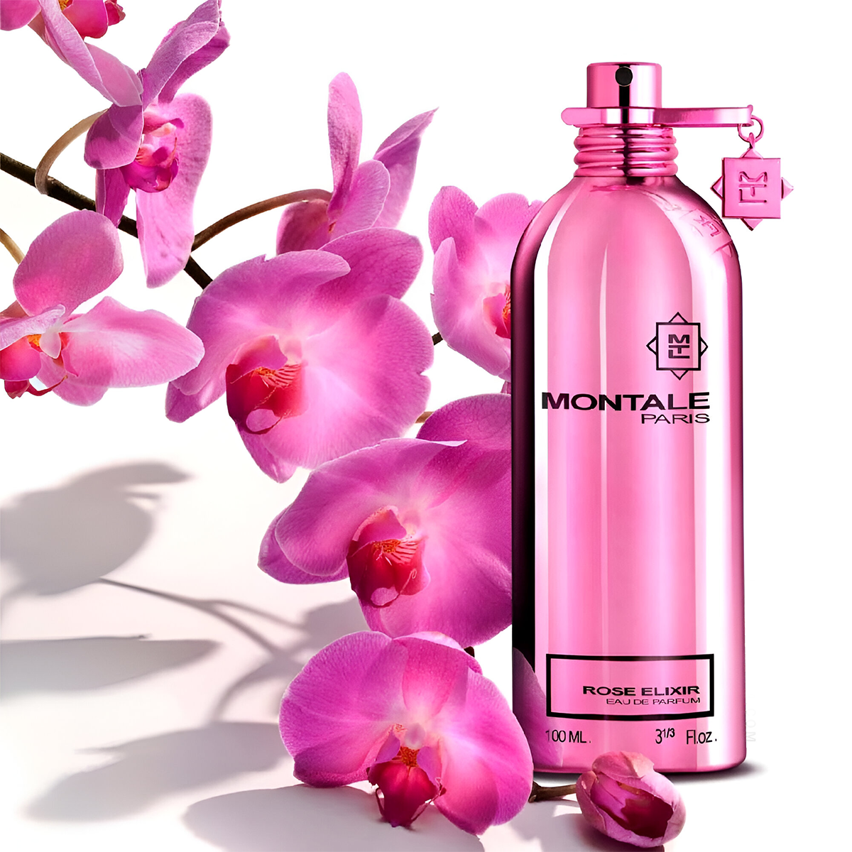 Montale Rose Elixir EDP smells like a lush bouquet of fresh roses with a sweet and fruity touch, creating a rich and romantic scent that's both elegant and enchanting.