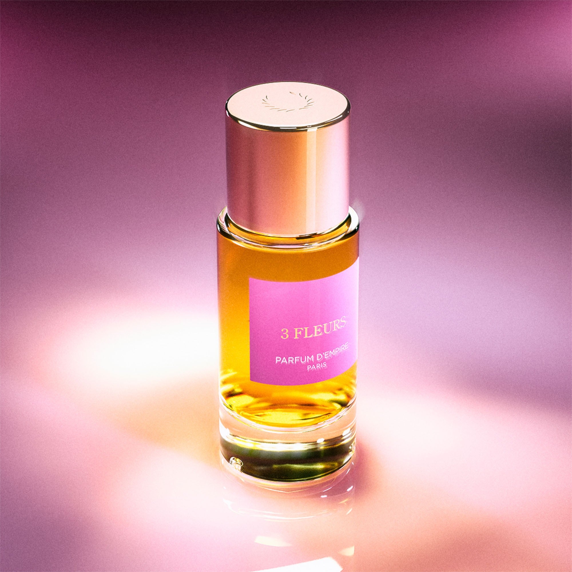 Experience Parfum D'Empire 3 Fleurs EDP: a timeless blend of rose, jasmine, and tuberose by Marc-Antoine Corticchiato.