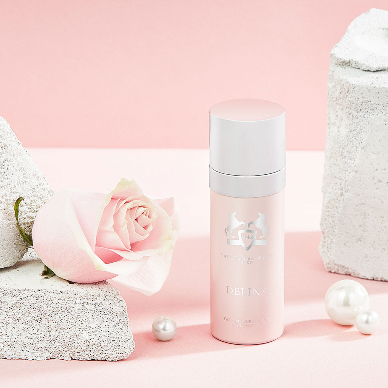 Parfums De Marly Delina Hair Perfume smells like a beautiful blend of fresh roses with hints of juicy rhubarb, sweet lychee, and zesty bergamot, creating a luxurious floral scent that nourishes your hair while leaving it delicately fragrant.