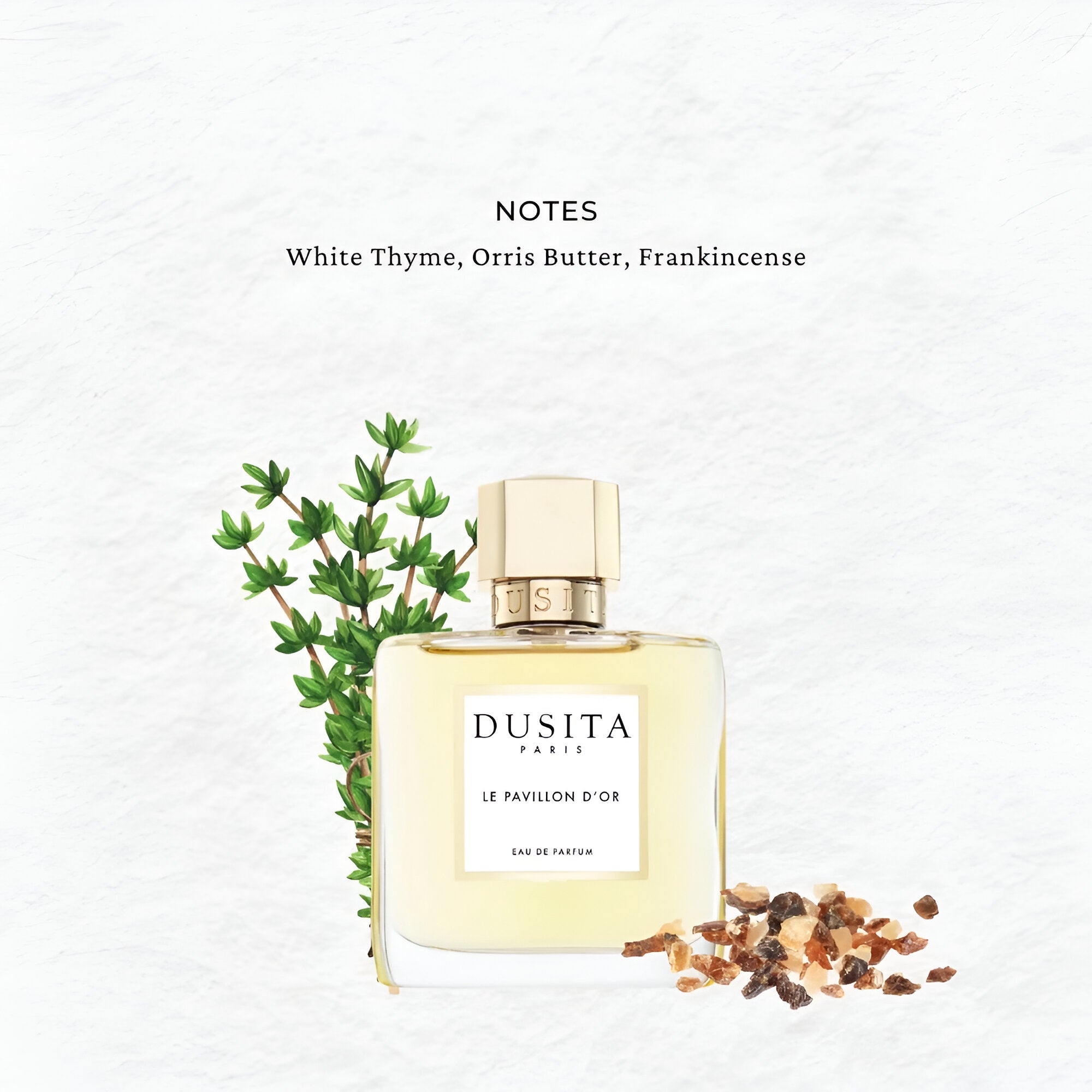 Parfums Dusita Le Pavillon D'Or EDP smells like a serene blend of woody and aromatic notes, mingling hints of mint, thyme, and honeysuckle with a soft, almond-like floral touch.