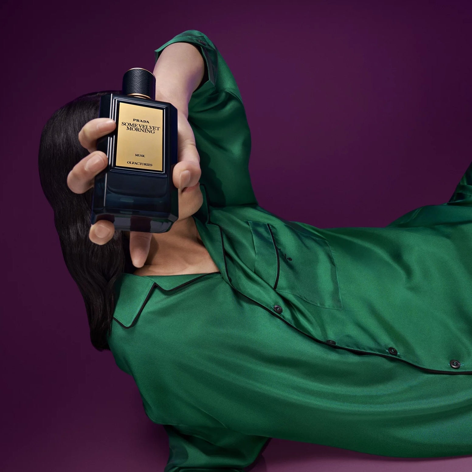 Prada's Some Velvet Morning Musk EDP features a musky scent with sweet vanilla and soft peach, accented by benzoin, patchouli, and hints of Italian mandarin, bitter almond, heliotrope, star anise, and tonka bean.