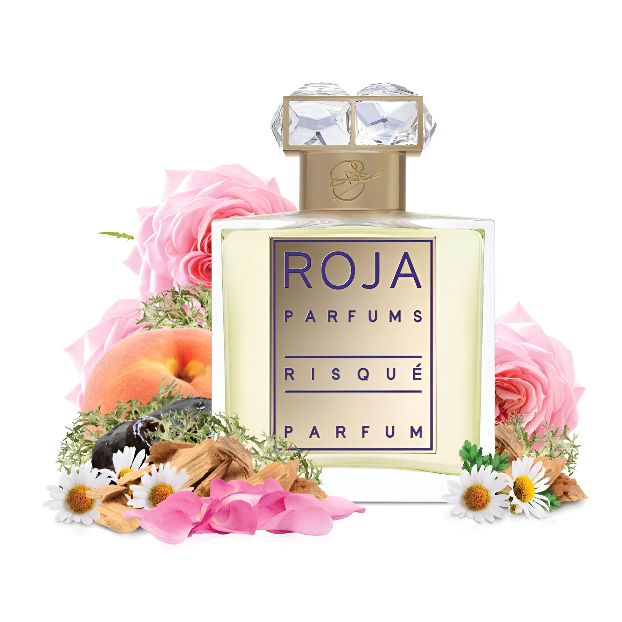 Roja Parfums Risque Pour Femme smells like a warm and seductive blend of fruity peach and bergamot, sweet chamomile, and rich base notes of vanilla, tonka, sandalwood, and patchouli, creating a luxurious and captivating fragrance.