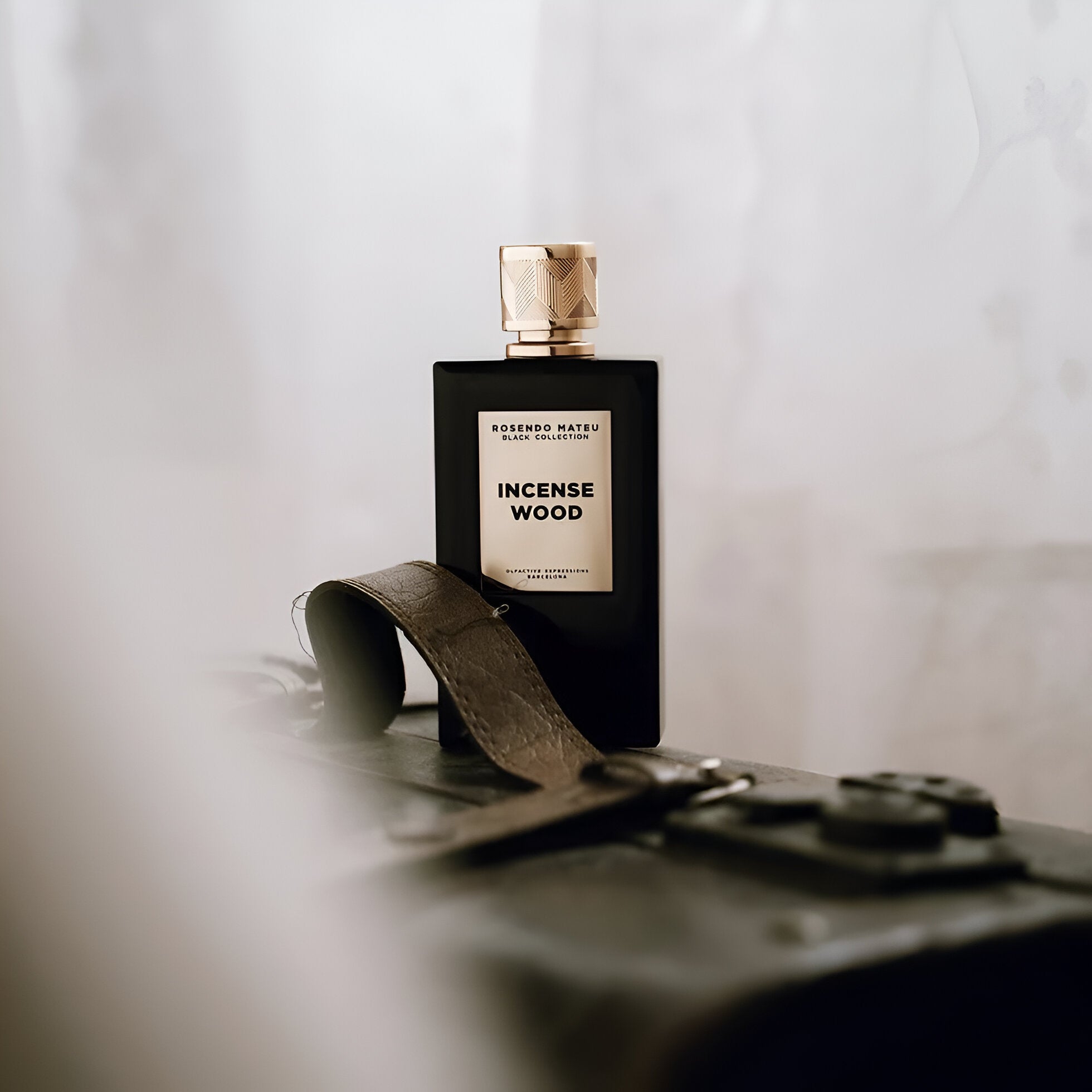 Embrace luxury with Rosendo Mateu's Incense Wood Parfum, featuring cardamom, bergamot, vanilla, and sandalwood in an elegant black bottle.