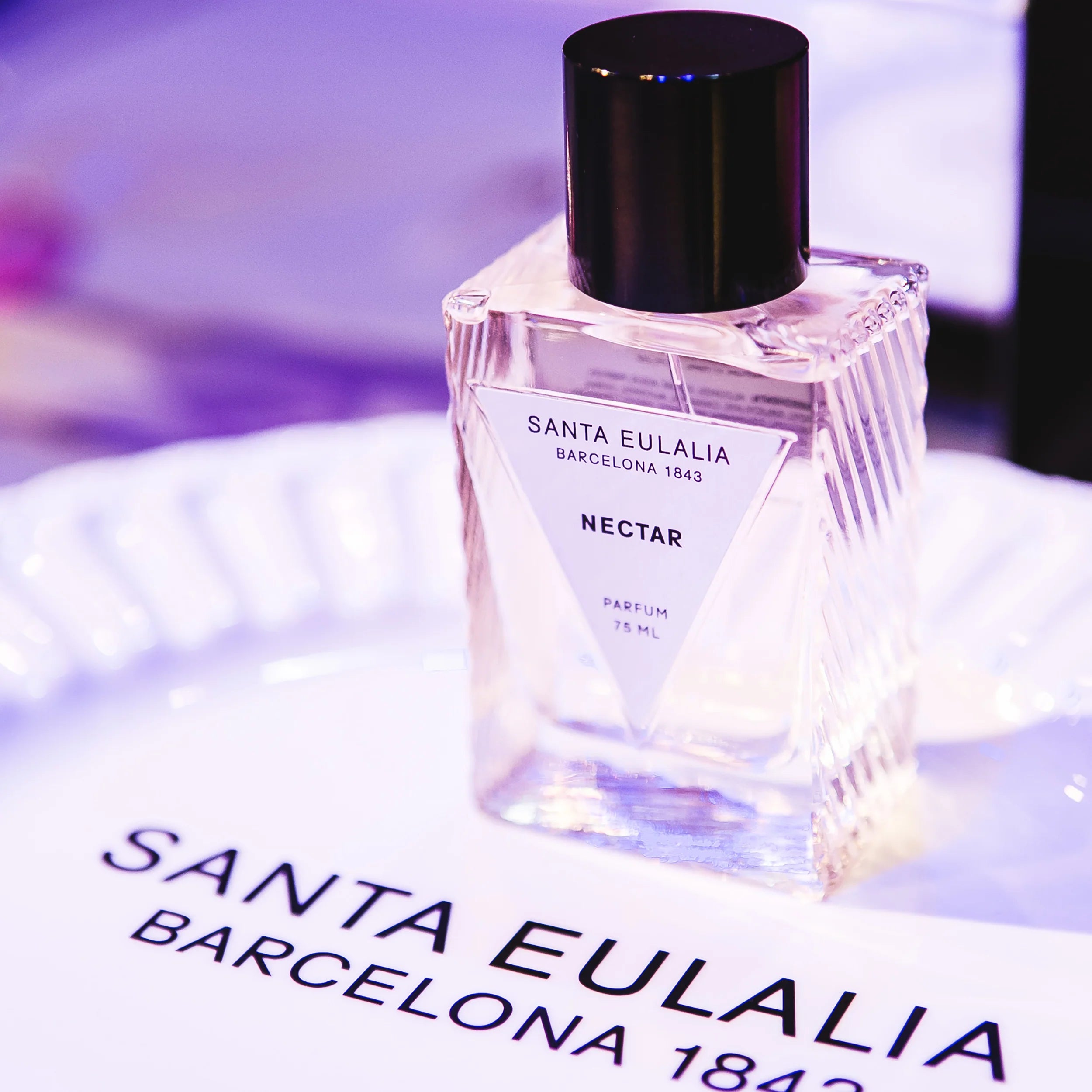 Experience a beach getaway with Santa Eulalia Nectar Parfum, featuring peachy, fruity notes, creamy sandalwood, and subtle vanilla.