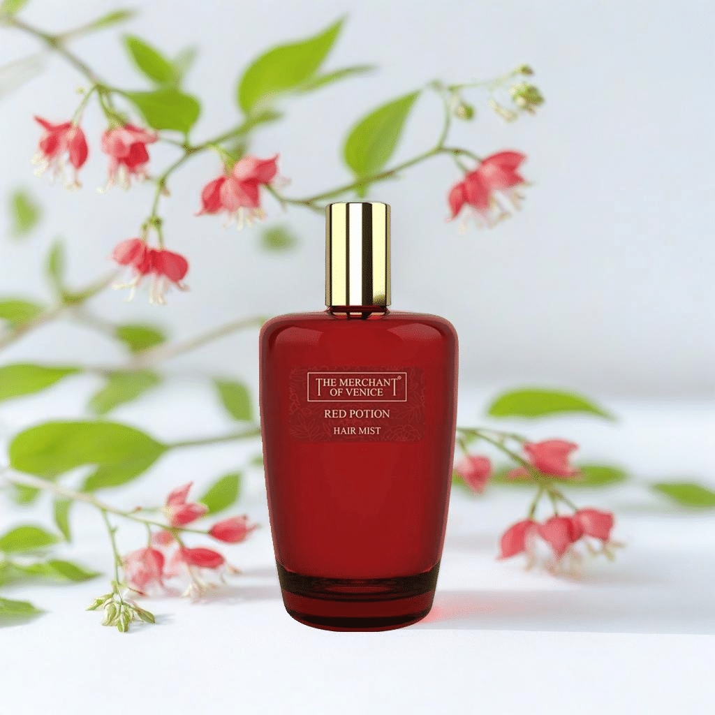 The Merchant Of Venice Red Potion Parfum Hair Mist exudes a majestic amber floral scent, with elegant top notes of Tagetes and Immortelle, perfect for anyone seeking to add a sophisticated touch to their style.