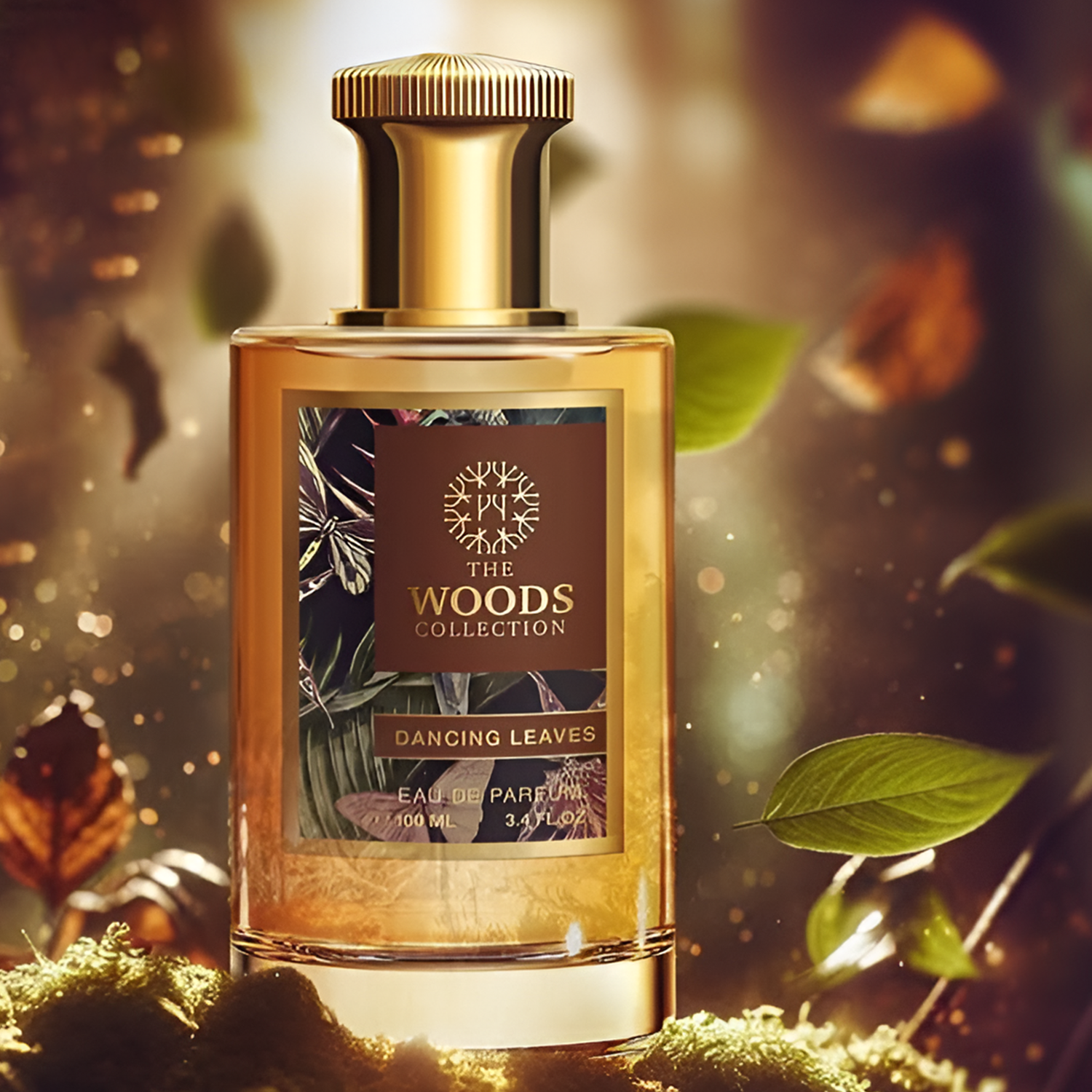 Dancing Leaves EDP offers a unisex, woody fragrance inspired by nature, featuring rosy notes and sandalwood for an enchanting experience.