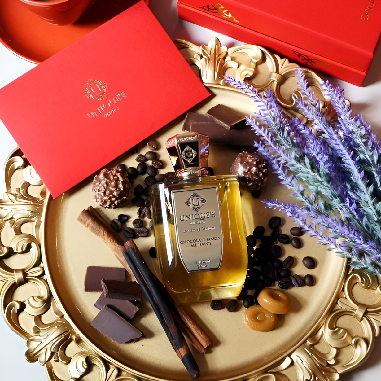 Experience joy in a bottle with Unique'E Luxury Chocolate Makes Me Happy, a unisex scent blending Caramel, Patchouli, Lime, and more.