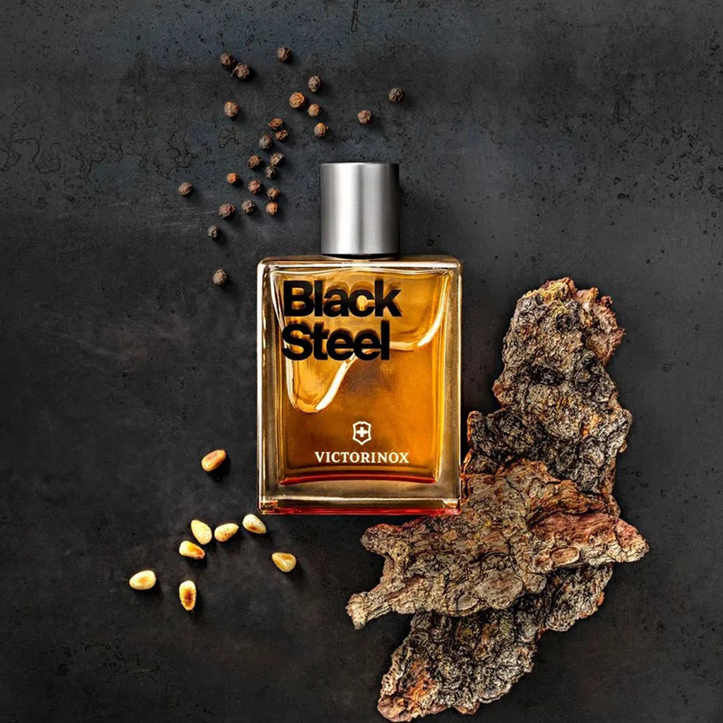 Victorinox Swiss Army Black Steel EDT smells bold and captivating, blending spicy black pepper and ginger with rich leather and smoky pine, creating a warm and magnetic scent that exudes strength and allure.